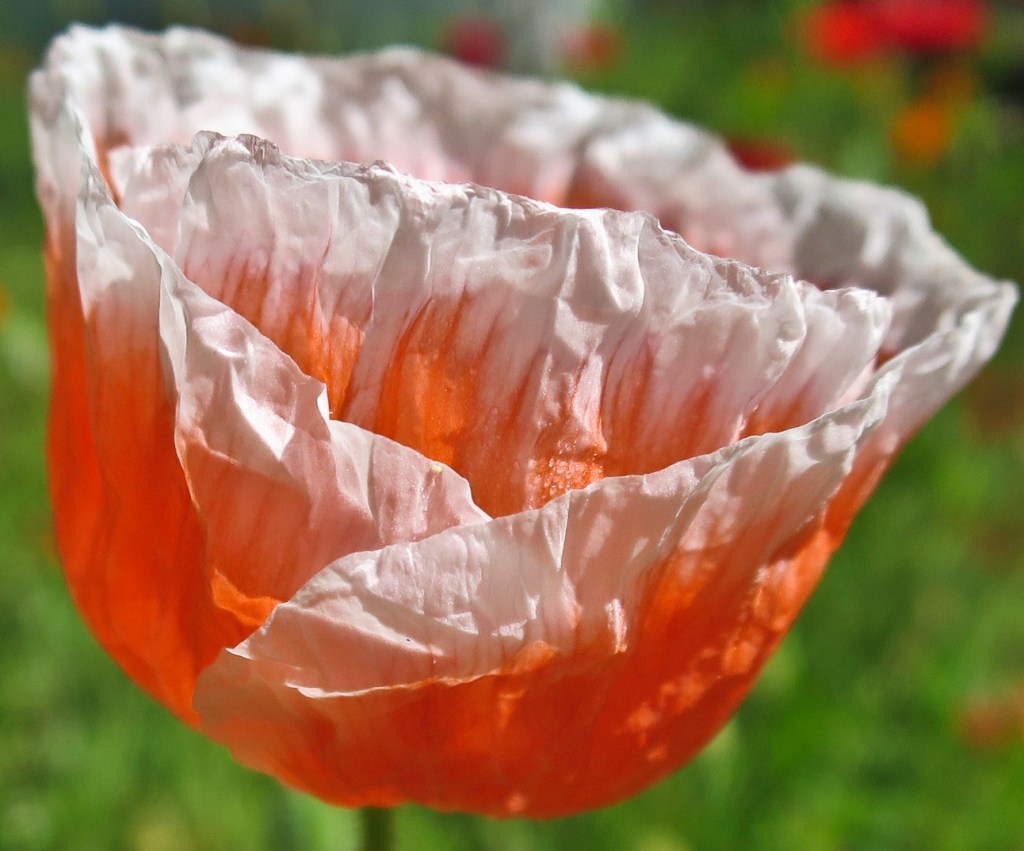 Bees harvest pollen from many flowers–in this case they are mostly red poppies. When bees deposit that pollen on other red poppies, new genetic variations develop inside new seeds. The next spring, when those seeds sprout and bloom, previously hidden recessive genes show up in some of the new plants. The new season’s blooming fashion runway show reveals extraordinary dressy outfits.